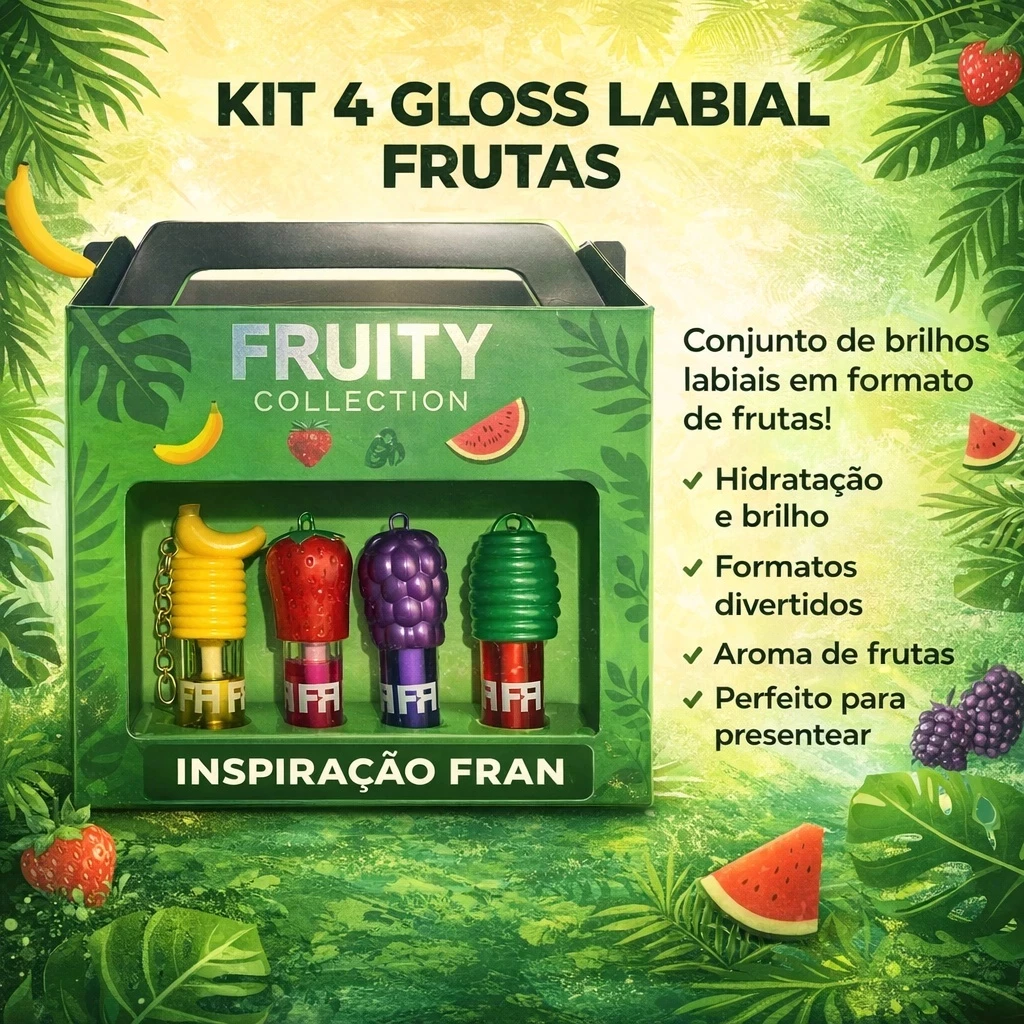 Com 4 unidades inspiradas no universo das frutas, esse kit traz uma proposta divertida e ao mesmo tempo apaixonante, ideal para realçar os lábios com brilho, cuidado e um visual cheio de personalidade.